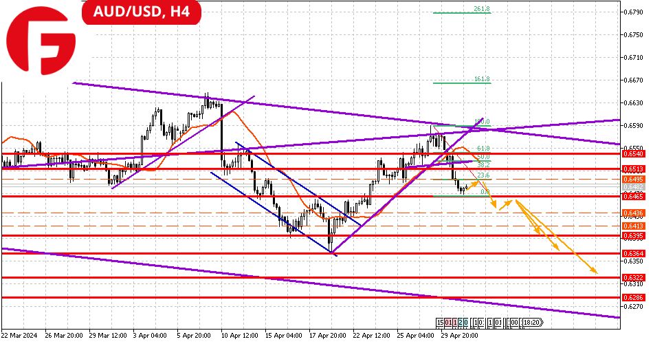 بعد رسم شكل "الرأس والكتفين" عند القمة المحلية للسوق، وبالتالي اختراق خط التصحيح واختباره من الأسفل إلى الأعلى، اخترق الأصل خط الرقبة. وعلى خلفية التوقعات الإيجابية للمتداولين، انخفض السعر بنحو 500 نقطة دون تصحيحات تذكر. توقف الانخفاض عند المستوى الرئيسي 0.6470.