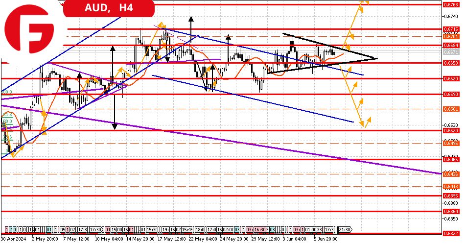 تعزيز السيناريو. بعد اختراق خط المقاومة العلوي، سوف يتماسك السعر فوق مستوى المقاومة 0.6685. في هذه الحالة فإن الأهداف الأقرب هي مستويات 0.6700 و 0.6715. في هذه الحالة، يتحول المثلث المتماثل إلى مثلث صاعد، مع ميزة إحصائية تتمثل في الاختراق الصعودي. وإذا ارتفع السعر أكثر، فإن الثبات فوق المستوى 0.6715 يخلق قمة محلية جديدة، مما سيسمح لنا بالحديث عن تشكيل اتجاه صاعد، والهدف الأول هو 0.6760.