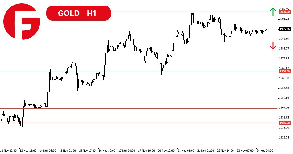 قبل افتتاح جلسة التداول الأمريكية، والتي سيتم اختصارها اليوم، كان تداول الذهب بطيئًا أقل من 2000 دولار للأونصة. ولكن حتى يتم كسر الدعم عند 1988 دولارًا، يظل السيناريو الصعودي هو الأولوية. سيتم تفعيله في لحظة الاختراق وتثبيت الأسعار فوق مستوى المقاومة الفنية الرئيسي البالغ 2006 دولارًا.