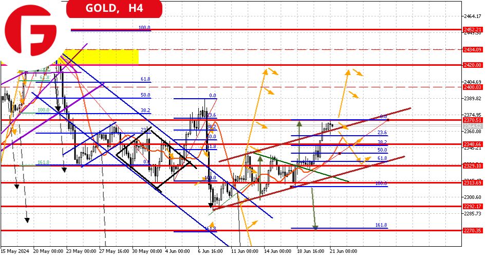ومع ذلك، فمن المحتمل جدًا أن ينزلق السعر إلى مرحلة تصحيحية. في حالة الارتداد من المستوى 2370 واختراق المستوى التصحيحي 23.6% (مستوى السعر 2360)، يمكننا أن نتوقع انخفاض السعر إلى المستوى التصحيحي 61.8% (مستوى السعر 2330)، مع متوسط المستويات 2340 و 2350.